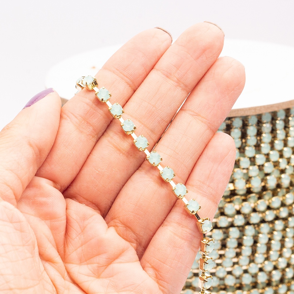Rolo Corrente de Strass SS29 Verde Água Leitoso Dourado – 20 Metros